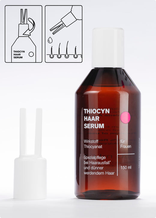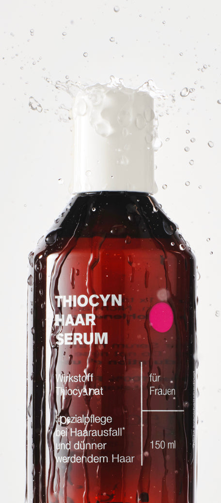 Der körpereigene Wirkstoff Thiocyanat ist von essenzieller Bedeutung für den Zellstoffwechsel und somit auch wichtig für das Haarwachstum. Thiocyn Haarserum entlastet mit seinem patentierten Thiocyanat-Wirkkomplex die Haarwurzel, versorgt sie und aktiviert den Zellstoffwechsel unspezifisch. Die Haarwurzeln werden gestärkt und dadurch gegen eine Vielzahl wachstumsstörender Einflüsse geschützt.